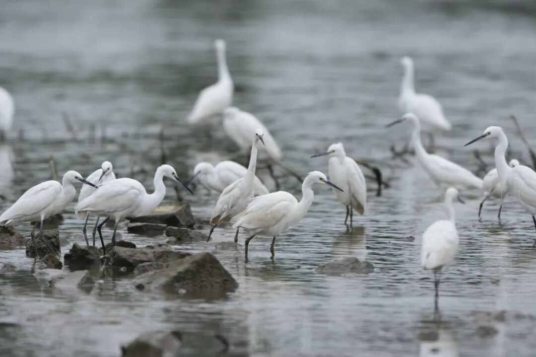 夕阳把湖面染成暖金色,滩涂上聚满了 “食客”。大批鹭鸟成群集结,低头觅食、轻声交谈。